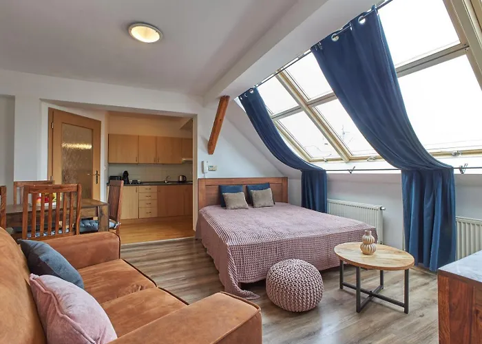 Goście mogą przygotowywać posiłki w pełnowymiarowej kuchni. Estrella restaurant oferuje dania kuchni współczesnej. Znajduje się zalewie w ciągu 5 min spacerem od obiektu. Obiekt leży 5 min piechotą od najbliższego przystanku autobusowego Myslikova.